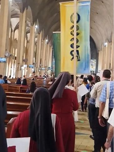 Opening of the 75th Baclaran Pilgrimage outside Baclaran church on 23 June 2023. Sr. Alice is seen holding the OSSR board (arrowed). Click on videos to view "Opening Ceremony".