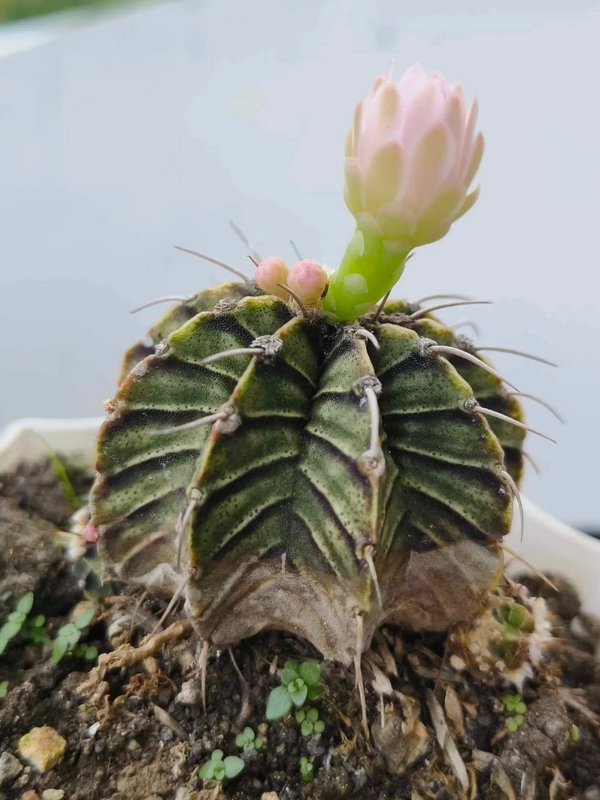 Gymnocalycium, commonly called chin cactus, is a genus of about 70 South American species of cactus. The genus name Gymnocalycium (from Greek, "naked calyx") refers to the flower buds bearing no hair or spines.